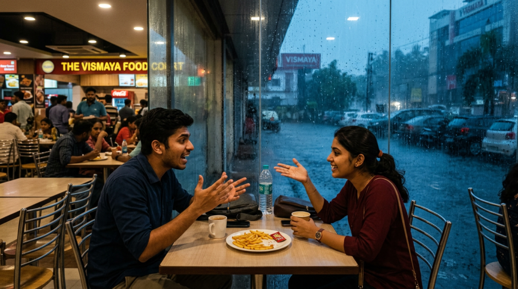 One evening, it poured. We both got stuck at the ground floor food court waiting for the rain to let up. We ended up sharing some pretty average fries from one of the counters. I don’t even remember how it started, but we spent an hour arguing about Malayalam movies. I told her the recent theater re-releases were just a way for producers to make easy money. She completely shut me down, arguing that seeing those old “mass” scenes with a crowd was a totally different experience. Watching her get all worked up about it, I realized I was in trouble. I was looking for her every time I walked through the lobby.
